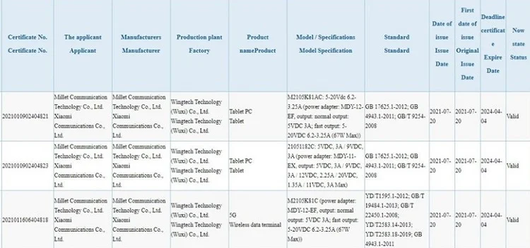 Theo đó, được mong chờ nhất là mẫu máy tính bảng Mi Pad 5, sẽ có các số model lần lượt là M2105K81AC, M2105K81C và 21051182C tương ứng với ba phiên bản cấu hình khác nhau.